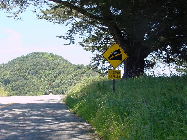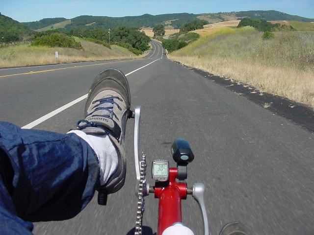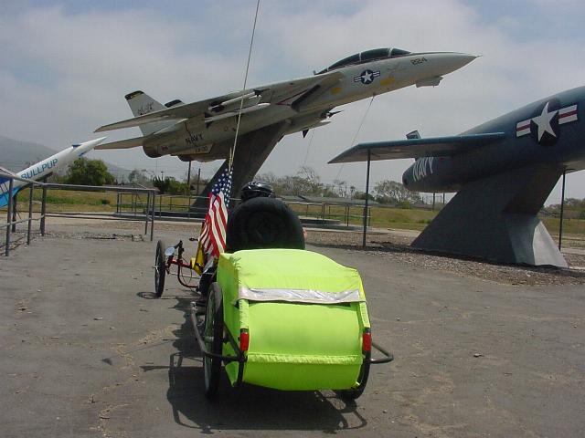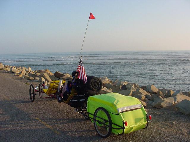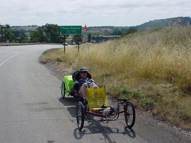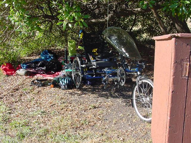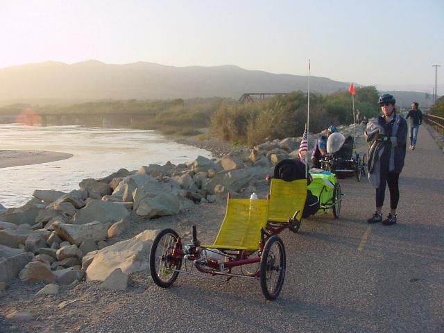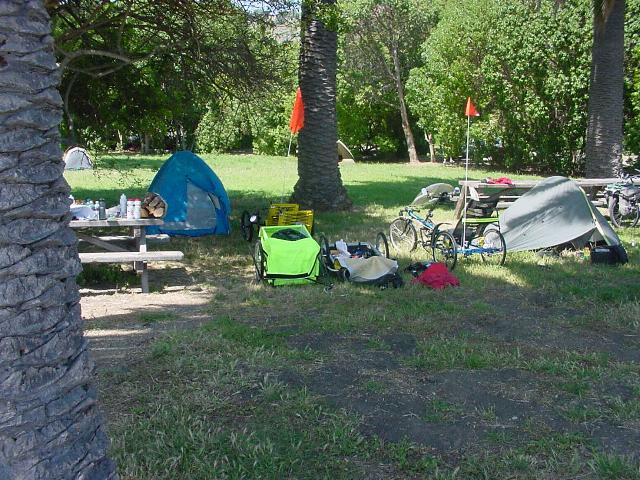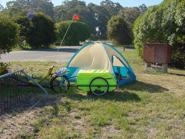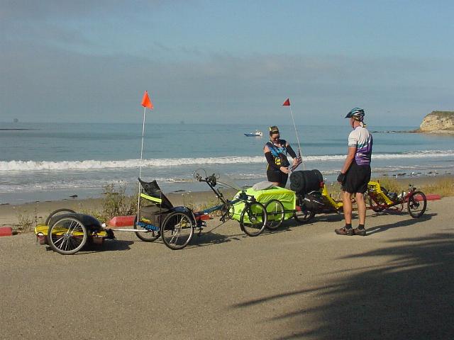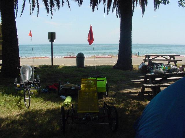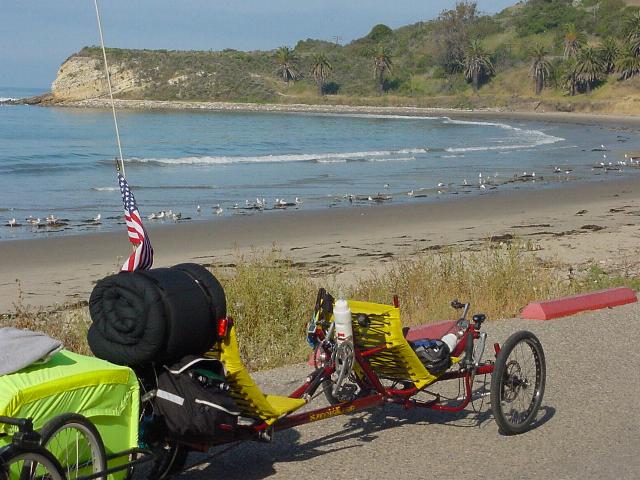 Few hours into the ride a cyclist told us about a shortcut, that it saved us 15 miles from the original plan. It sounded really good, till we saw the 8% grade sign. I didn't know how will the trailer follow at high speeds, and I wasn't sure if it would fishtail. Down the hill we went, and I loved it. The trike was speeding down the hill so fast, that I did not even have to pedal! The trailer was pushing us so hard that I felt like I was in control of a locomotive. The trailer was trailing so well that I only felt the weight pushing. I had to stay on the brake more than I wanted to. However, the trike quickly accelerated, and in no time, we reached speeds up to 45 mph. Boy, the 8" Hayes were hot, holding back close to 200 lbs in equipment. We got to the bottom of the hill and waited on Parky. He had to stop a few times to let the rims cool off. Few hours later we got to Moro Bay, and after a pizza diner, we decided to camp in Pismo Beach since we saved some time with the shortcut. In the Hike and Bike campsite, Lissa and I pulled up the tent, but Parky tired from the long ride, decided not to put up his tent and take a chance on the morning fog, and slept under a tree.