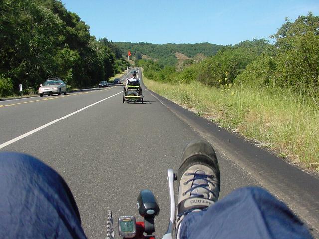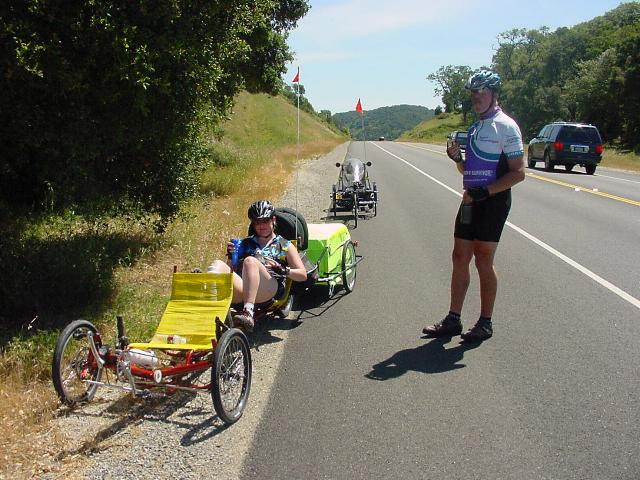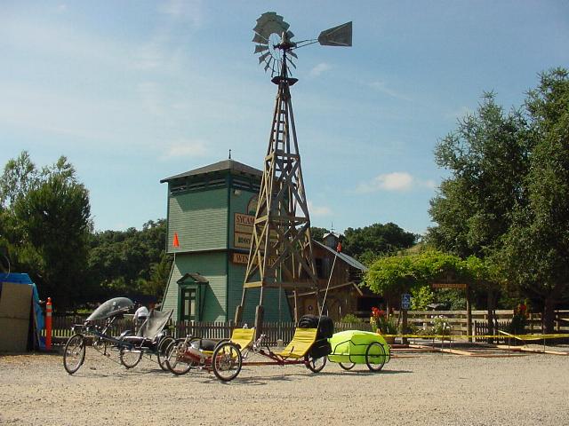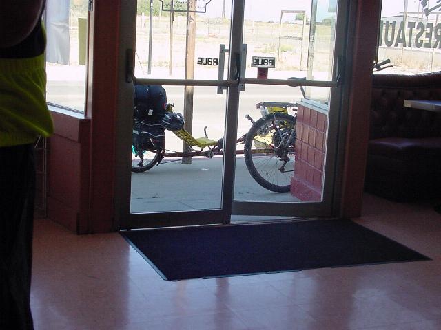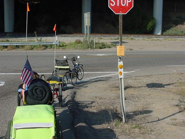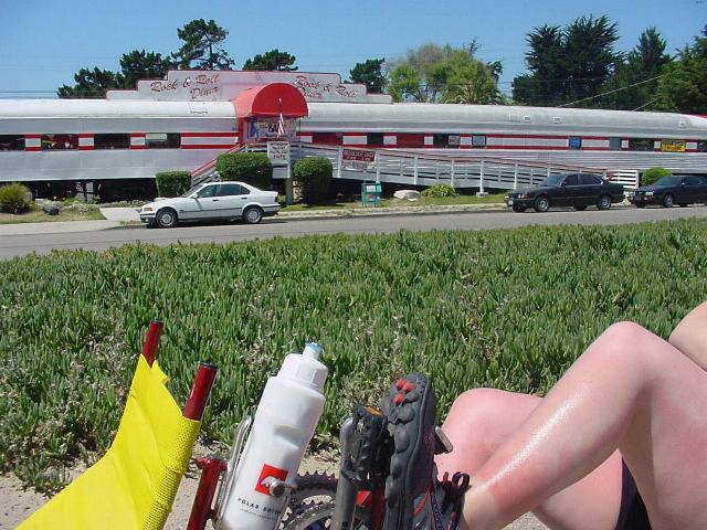 Sunday morning we took a ride in the city and checked out the classic car show ( pictures ) . Later on we singed up for the Concourse D'Elegance ( pictures )a bike show, where we entered the "Szocializer" in the Tandem category. I got a lot of complements, but in the end it didn't make the first three places. I had a chance to meet a lot of people, and Lissa got to brag about the trike. Monday morning we got up early, picked up camp, and packed the trailer. I was really surprised how heavy it was by the time we packed everything in it. Later, when I got home, I weight it and it was close to 100 Lb. I had never used the trailer before since I just finished it a few days before living to Paso, so it was a first. We pulled out from the Fairgrounds, and headed towards Moro Bay. Before living Paso, we stopped at a local Café and had breakfast. At nine o'clock we finally hit the road.